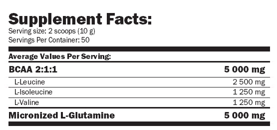 - 10 000 mg of BCAAs and L-Glutamine per serving