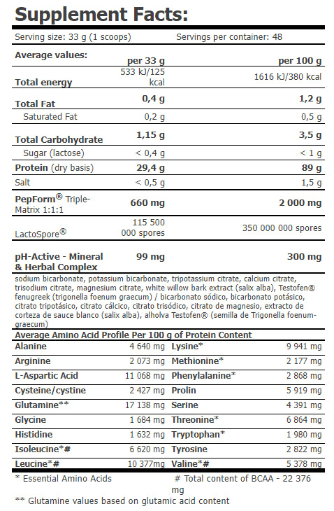 Ingredients: partially hydrolyzed CFM® whey protein isolate /from milk/ - Hydrovon® - 95%, cocoa powder (only for flavour: double chocolate and peanut butter cookies); PepForm®-L-Leucine peptides (whey peptides /from milk/, L-Leucine peptides, L-Leucine), PepForm®-BCAA peptides (whey peptides /from milk/, BCAA peptides, L-Leucine, L-Isoleucine, L-Valine), Pep-Form®-Tryptophan peptides (whey peptides /from milk/, L-Tryptophan peptides, L-Tryptophan), aroma; beetroot juice (only for french strawberry yogurt flavour), stabilizer: sodium carboxymethylcellulose; emulsifier: soya lecithin; sodium chloride, sodium bicarbonate, potassium bicarbonate, tripotassium citrate, calcium citrate, trisodium citrate, magnesium citrate, white willow bark extract (salix alba), Testofen® fenugreek (trigonella foenum graecumseed), sweeteners: sucralose, acesulfame-K and steviol glycosides; dye: curcumine (only for creamy vanilla milk flavour); LactoSpore™ (Bacillus coagulans, maltodextrin).