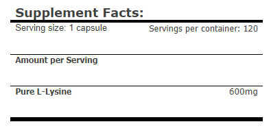 Ingredients: L-Lysine, gelatin capsule (made from pure gelatin, water, dye: titanium dioxide), anticaking agents: magnesium stearate, silicon dioxide