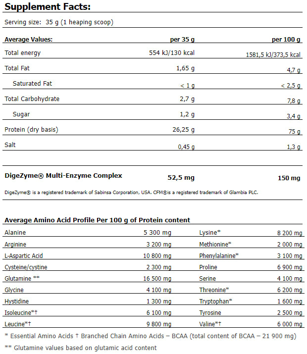 High quality whey protein with great full taste without aspartame. It consists of 75% pure protein, composed of Low Temperature Processed Instantized Whey Concentrate (WPC) and CFM® Whey Isolate that ensures a high biological value.