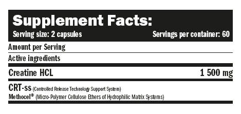 Ingredients: Creatine HCl, gelatin capsule (made from pure gelatin, water, dyes: titanium dioxide), stabilizer: hydroxypropylmethylcellulose Methocel®, anticaking agents: magnesium stearate, silicon dioxide