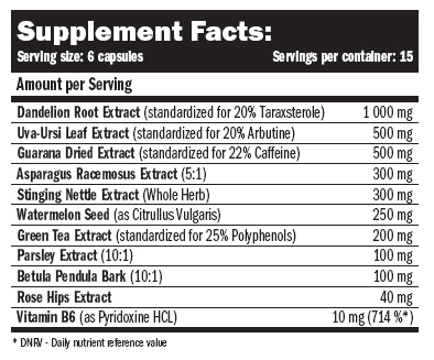 Ingredients: Dandelion root extract (taraxacum officinale), gelatin capsule (made from pure gelatin, water, dye: titanium dioxide), Uva-Ursi leaf extract (arctostaphylos uva-ursi), Guarana dried extract (22% caffeine) (paullinia cupana – seeds), Asparagus Racemosus extract (root), Stinging Nettle extract (urtica dioica – root), Watermelon dried extract (citrullus vulgaris – fruit pulp), Green Tea extract (camellia sinensis – leaf), Tripotassium citrate, Parsley extract (petroselinum hortense – leaves and stem), Betula Pendula bark, Rose Hip extract (rosa canina –fruit), Pyridoxine HCl (Vitamin B6), stabilizer: hydroxypropylmethylcellulose (Methocel®); anticaking agents: magnesium stearate, silicon dioxide