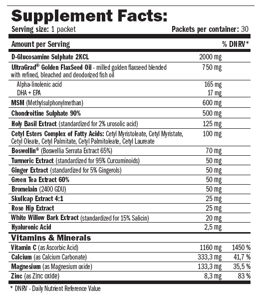 Ingredients: D-Glucosamine sulphate 2 KCl /from shellfish/, ascorbic acid, UltraGrad® golden flaxseed oil /with fish oil/, MSM (methylsulfonylmethane), chondroitine sulphate 90%, gelatin capsule (made from pure gelatin, water, dye: titanium dioxide), calcium carbonate, magnesium oxide, holy basil extract (2% ursolic acid), cetyl esters complex of fatty acids (cetyl myristoleate, cetyl myristate, cetyl oleate, cetyl palmitate, cetyl palmitoleate, cetyl laureate, maltodextrin, arabic gum); boswellia serrata extract 65% (Boswellin®), turmeric extract (95% curcuminoids), ginger extract (5% gingerols), green tea extract 60%, bromelain (2400 GDU), skullcap extract (4:1), stabilizer: hydroxypropylmethylcellulose Methocel®; anticaking agents: microcrystalline cellulose, magnesium stearate; rose hip extract, white willow bark extract (15% salicin), anticaking agents: stearic acid, silicon dioxide; stabilizers: inuline, carboxymethylcellulose; zinc oxide, hyaluronic acid