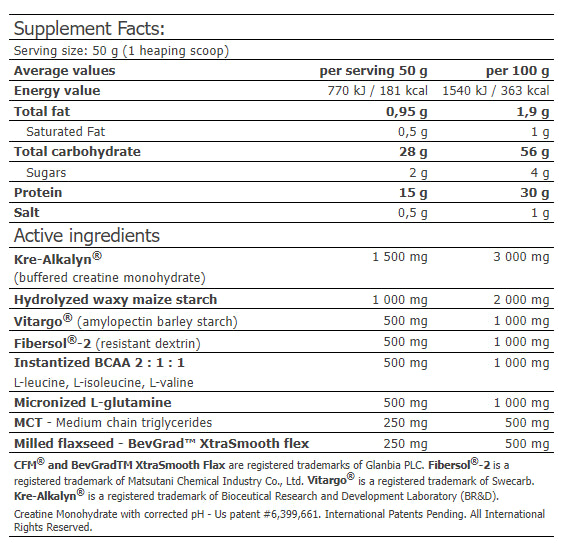 Ingredients: glucose polymers (maltodextrin), hydrolyzed Beef Peptide HydroBeef™ - 30%, cocoa powder (only in chocolate flavour), rice polysaccharides, buffered creatine monohydrate (Kre-Alkalyn®), ultra high-molecular weight long chain hydrolyzed waxy maize starch, amylopectin barley starch (Vitargo®), digestion resistant maltodextrin (Fibersol®-2), instantized branched chain amino acids (BCAA 2:1:1 - L-leucine, L-isoleucine, L-valine), micronized L-glutamine, aroma, medium chain triglycerides (MCT powder – triglycerides caprylic acid/capric acid, sodium caseinate, glucose syrup, emulsifier: E472c), milled flaxseed BevGrad™ XtraSmooth Flax, stabilizer: sodium carboxymethylcellulose; emulsifier: soya lecithin; beetroot juice (only in delicate forest fruits flavour); sodium chloride, sweeteners: sucralose, acesulfame-K and steviol glycosides.