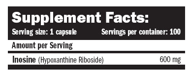 Ingredients:Inosine (hypoxanthine riboside), vegetable capsule (hydroxypropylmethylcellulose, purified water, dye: calcium carbonate), anticaking agents: magnesium stearate and silicon dioxide.