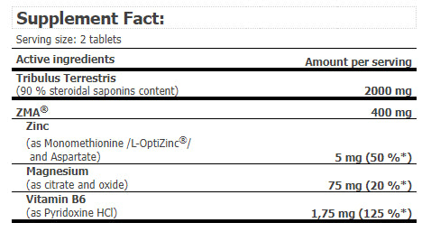 Ingredients: Tribulus terrestris (whole plant), ZMA® (zinc in the form L-monomethionine sulphate and L-aspartate; magnesium citrate, magnesium oxide, pyridoxine HCl /vit. B6/), anticaking agent: microcrystalline cellulose; stabilizers: maltodextrin, di-calcium phosphate, croscarmellose sodium; anticaking agents: magnesium stearate and silicon dioxide.
