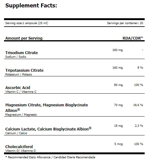 Ingredients: Purified water, Trisodium Citrate, Magnesium Citrate, Tripotassium Citrate, Ascorbic Acid, Magnesium Bisglycinate, Calcium Lactate, Calcium Bisglycinate, preserving agent: potassium sorbate and sodium benzoate; acidifying agent: citric acid; Cholecalciferol, aroma, dye: black currant flavour (azorubine, ponceau 4R, brilliant blue), orange flavour (carotene, apo-carotenal); sweeteners: acesulfame-K and sucralose