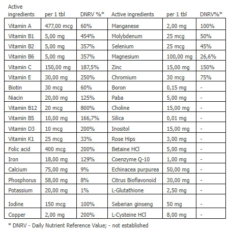 Ingredients: Dicalcium phosphate, Magnesium oxide, Ascorbic Acid (Vitamin C), thickeners: Cellulose; Dl-alpha toco-acetate (Vitamin E), Ferrous Fumarate, Echinacea Purpurea, Eleutherococcus Senticosus root (Siberian ginseng), Potassium Chloride, Choline Bitartrate, Citrus bioflavonoid, glazing agent: Stearic acid, Niacinamide (niacin), Zinc oxide, stabilizer: hydroxypropylmethylcellulose; Inositol, D-Calcium Pantothenate (Vitamin B5), anticaking agent: Magnesium stearate; L-Cysteine HCl, Copper sulphate, Manganese sulphate, Pyridoxine HCl (Vitamin B6), Thiamine HCl (Vitamin B1), Riboflavine (Vitamin B2), PABA (Para-aminobenzoic acid), Betaine HCl, dye: calcium carbonate; Folic acid 10%, Cholecalciferol (Vitamin D3), Biotin 1%, Beta-Carotene, Rose hips powder, Sodium Selenate 1%, L-Glutathione reduced, Cyanocobalamin 1% (Vitamin B12), Retinyl acetate (Vitamin A), Coenzyme Q10, Phytonadione 5% (Vitamin K1), boric acid, dyes: Allura red AC, Sunset Yellow FCF; anti-foaming agent: PEG, Potassium Iodide, Chromium Chloride, Molybdate sodium, humectant: triacetin (E1518).