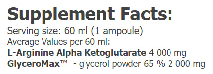 Ingredients: Purified water, L-Arginine alpha ketoglutarate, GlyceroMax™ - glycerol powdered 65%; acidifying agent: phosphoric acid; preserving agents: potassium sorbate, sodium benzoate; aroma, stabilizer: xanthan gum; sweetener: sucralose.