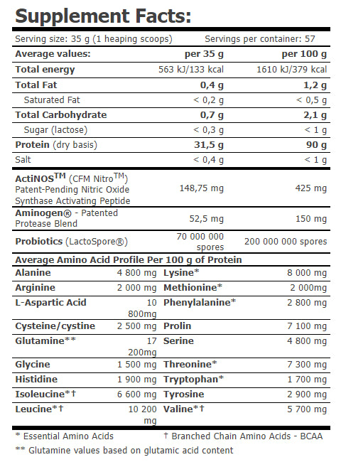 Ingredients: CFM® - Cross Flow Microfiltered Whey Protein Isolate /from milk/ with protein fractions (Beta-Lactoglobulin, Alfa-Lactoglobulin, Serum Albumin, Immunoglobulin, Glycomacropeptide, Lactoferrin, Lactoperoxidase); cocoa powder (only in chocolate and banoffee flavour), stabilizer: sodium carboxymethylcellulose; aroma, ActiNOSTM - selectively enriched Bioactive Peptides and Proteins from Whey /from milk/, emulsifier: soya lecithin; sweeteners: steviol glycosides, sucralose and acesulfame-K; dye: turmeric (only in milky vanilla flavour); beetroot juice (only in strawberry-yogurt flavour); Aminogen® (maltodextrin, protease blend), LactoSporeTM (bacillus coagulans, maltodextrin).