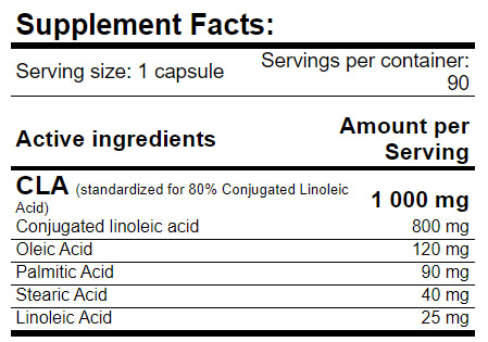 Ingredients: conjugated linoleic acid (from safflower oil), gelatin capsule (made from pure gelatin, thickener: glycerol, water).
