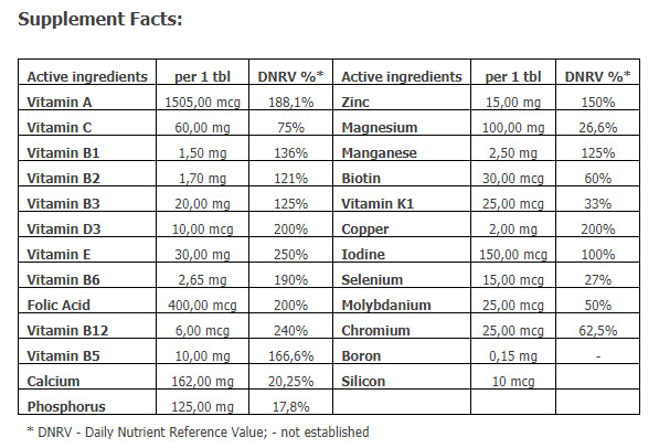 Ingredients: Di-Calcium phosphate (calcium, phosphorus), magnesium oxide (magnesium), potassium chloride (potassium), ascorbic acid (vit. C), DL-Alpha toco acetate (vit. E), anti-caking agent: cellulose, coating (carnauba wax /E903/, ferrous fumarate /iron/, stabiliser: hypromellose, dyes: titanium dioxide, sunset yellow FCF); niacinamide (vit. B3), stabiliser: croscarmellose sodium; zinc oxide (zinc), potassium iodide (iodine), D-Calcium pantothenate (vit. B5), vitamin A (acetate), anti-caking agent: magnesium stearate; glazing agent: stearic acid; manganese sulfate (manganese), cholecalciferol (vit. D3), folic acid, pyridoxine HCl (vit. B6), biotin, boric acid (boron), copper oxide (copper), thiamine HCl (vit. B1), riboflavin (vit. B2), selenious acid (selenium), cyanocobalamin (vit. B12), molybdate sodium (molybdanium), vitamin K1 (phytonadione), beta carotene (vit. A), chromium chloride (chromium), anticaking agent: silicon dioxide (silicon) and triacetin (E1518).