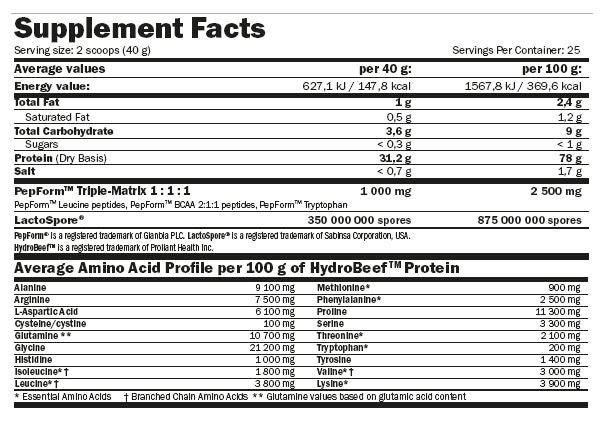 Ingredients: hydrolyzed beef peptide protein HydroBeefTM, cocoa powder, maltodextrin, PepForm® L-Leucine peptides (whey peptides /from milk/, L-leucine peptides, L-leucine), PepForm® BCAA peptides (whey peptides /from milk/, BCAA peptides, L-leucine, L-isoleucine, L-valine), Pep-Form®-Tryptophan peptides (whey peptides /from milk/, L-tryptophan peptides, L-tryptophan), aroma, stabilizer: collagen hydrolyzate; sweeteners: sucralose, steviol glycosides and acesulfame-K; sodium chloride, anti-foaming agent: silicon dioxide; LactoSporeTM (Bacillus coagulans, maltodextrin).